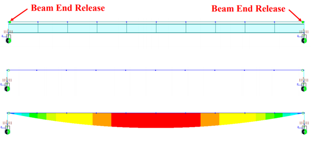 For a simply supported beam, you may have the link properly defined but you could end up getting unexpected result without careful validation. For the simply supported beam below, we are seeing some negative moment at the end. This is not what we expect to see in a simply supported beam, and is due to the support not being at the CG (centroid) of the section. However, if you add beam end releases, the negative moments at the ends will drop to zero