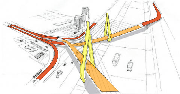 Due to this structural necessity, an X-shaped tower was proposed where the overlapping of the decks happens just right below the tower; the inclined masts intersect, bracing each other.