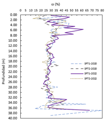 Por otra parte, enfocándonos en las arenas pumíticas detectadas desde los 3.60 a 7.80 m, se observó que es el estrato que presenta mayor contenido de agua, debido a la gran cantidad de vacíos internos en sus partículas vesiculares. En la Figura 4 se observa cómo fue variando el contenido de agua, dependiendo de la historia del humedecimiento – secado debido a las condiciones climatológicas e hidráulicas que han sufrido estos materiales con el paso del tiempo.